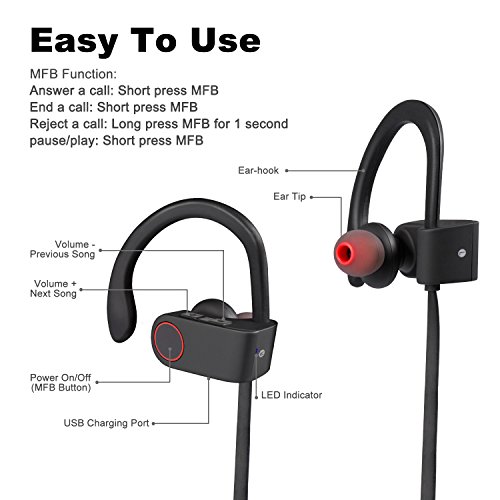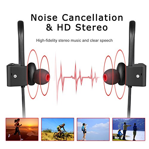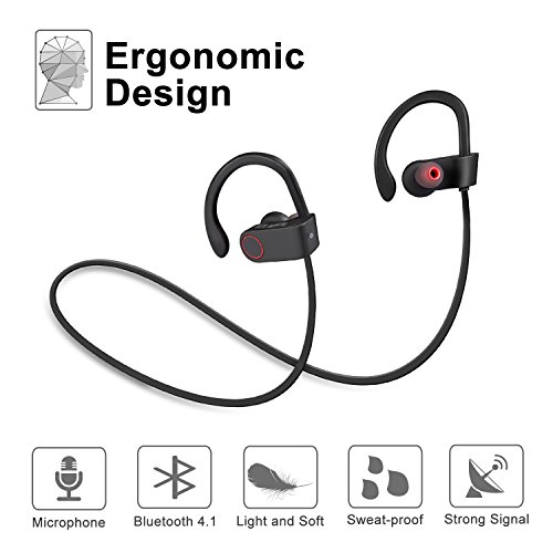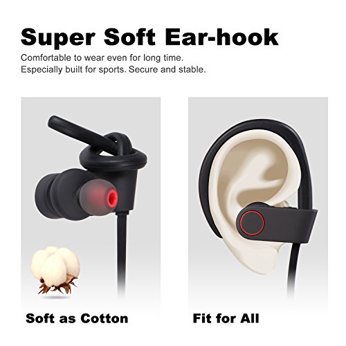 Feature : NEVER FALL OUT: The ergonomically-shaped earhooks increase wearing comfort and always keep earbuds in place during day-to-day use, never fall out even during running, jogging, yoga, etc. / COMFORTABLE and SECURE FIT: The angled-in silicone eartips are extra soft and flexible to sit securely in the ear canals, making the wearing unnoticed even for long time, multi-sized eartips for you to find the best fit one. / NOISE CANCELLATION: CVC 6.0 noise cancelling tech intelligently filters most ambient sound, combining the expert HD mic with better voice reception provides you clear, pleasant call chat. / BLUETOOTH V4.1 and UNIVERSAL CONNECTIVITY: Fast and easy connection with latest Bluetooth V4.1 tech, compatible with iPhone 6/6 plus/6s/6s plus, 5/5s/5c/SE, iPad 4, iPad Mini, Air, iPod Touch, Samsung Galaxy S7, HTC, Blackberry, Tablets, MP4, etc. / LONG BATTERY LIFE and WARRANTY: High performance battery offers a rapid full charge of around 1.5h to last up to 8 hours of playback/talk. 12-MONTH NO-HASSLE WARRANTY.