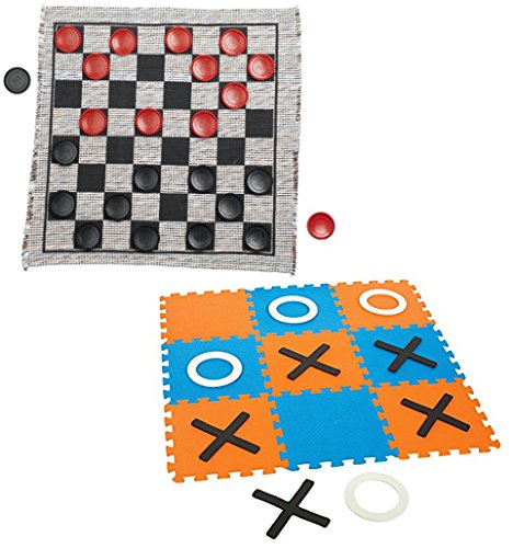 Bundle Includes Giant Tic-Tac-Toe Game and Jumbo Checker Rug Game It's two games in one! Sturdy foam blocks attach in puzzle-like pieces to form the 3' x 3' game grid. Choose TIC-TAC-TOE or Hopscotch. Play indoors or outdoors on a flat surface. Includes nine interlocking foam tiles, five O's and five X's. This unique checker rug with jumbo checkers is ideal for all ages - from young children to older adults. The large vinyl playing pieces (3" in diameter) are nearly impossible to misplace and they are safe for young children. Ideal as an enjoyable past time! The rug is machine washable...low temperature washing drying. Jumbo Checker Rug is constructed of synthetic and natural fibers (cotton, polyester/cotton, and possibly wool) 0 |