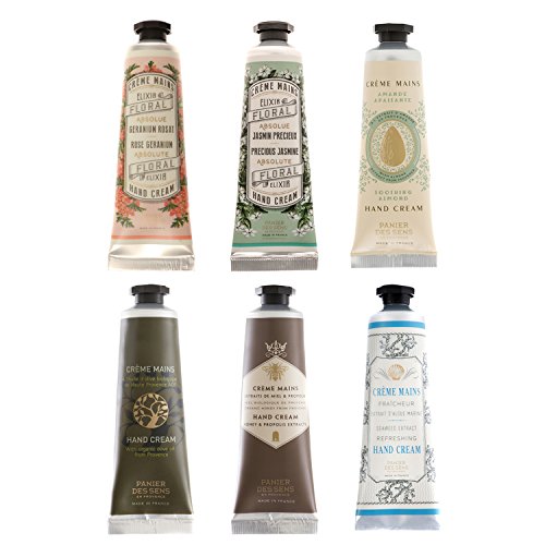 - Six item set that includes six 1-ounce Panier Des Sens nourishing and soothing hand creams in the following scents: Rose Geranium, Precious Jasmine, Sweet Almond, Olive Oil, Honey and Refreshing.