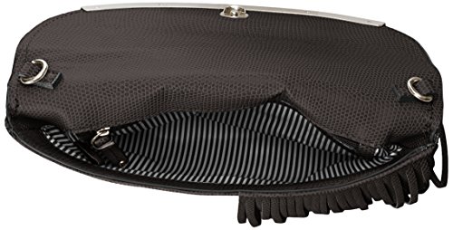 - Feature : Pockets: 1 exterior, 1 interior / Removable strap length: 48" / Convertible cross-body/clutch featuring decorative front-to-back fringe loops and logo-engraved plate at front flap