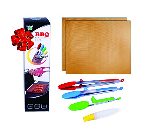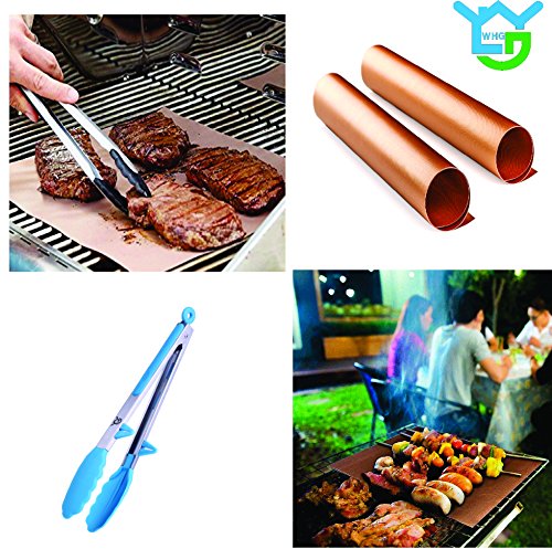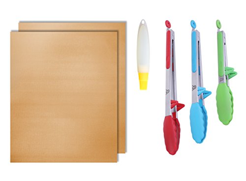 Deluxe BBQ Tools - Copper Grill Mats & Silicone Tongs Oil Brush Heat Resistant Set – Non Stick Grilling Accessories Tool Kit for Gas , Charcoal Grills Kitchen Cooking Baking As Seen On TV - 6 Pieces