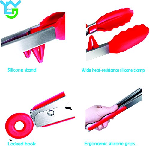 SUPER STRONG - DURABLE – STUDY Our premium silicone tongs, brush, and copper grill mats are manufactured from a 100% Food Grade materials, BPA and PVC free and are heat resistant up to 480 degrees F, perfect for turning large cuts of meat while barbecuing! Multi-purpose use, no sticking silicone tong tip for effortless food release and clean up. The loop for hanging, the stand keep tong does not tough on counter-to or table, easy handle, long, medium, and short tong sizes
