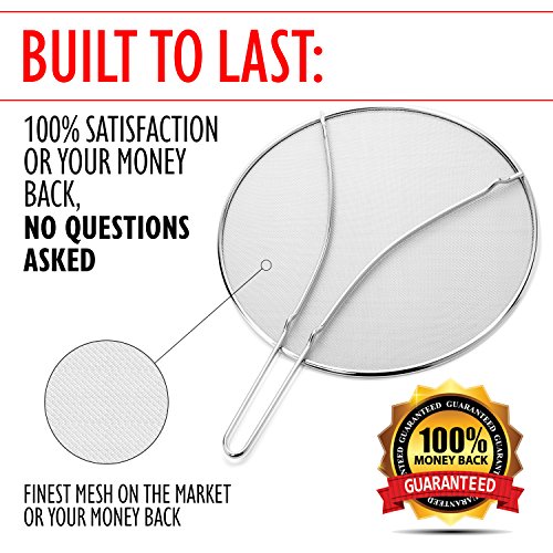 ★PREMIUM QUALITY: Our grease splatter screen is an intelligent quality build that is heavy duty having a very nice weight to it making it truly a luxurious kitchenware addition. Don't waste your money on flimsy, cheap knock-offs. Made from premium quality 304 stainless steel which means it is guaranteed rustproof or your money back! Of course it is dishwasher safe for time saving cleanup. Will last for years and years.