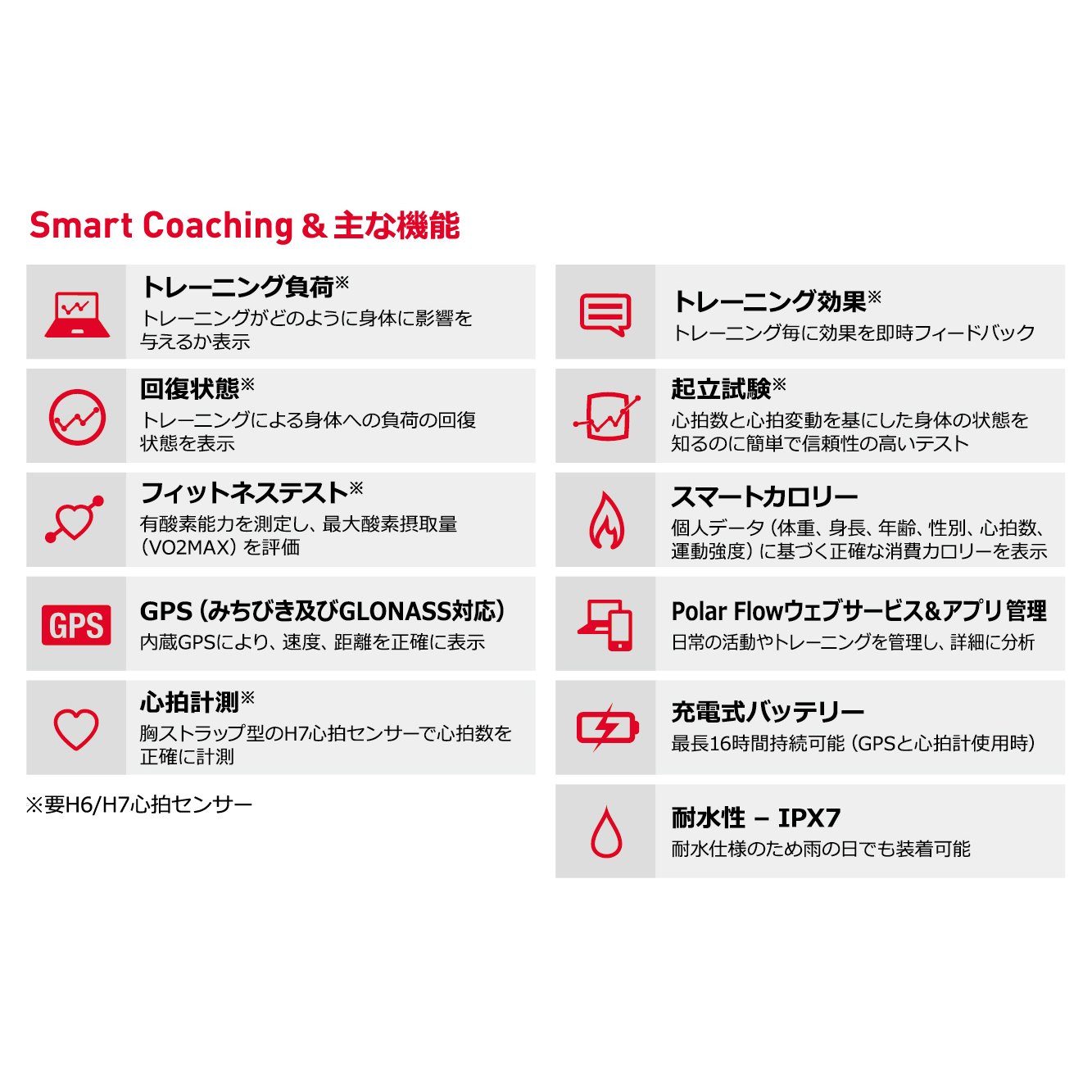 While realizing low price, we have extensive training functions including GPS function, barometer function, heart rate monitor function and Polar's original smart coaching function.