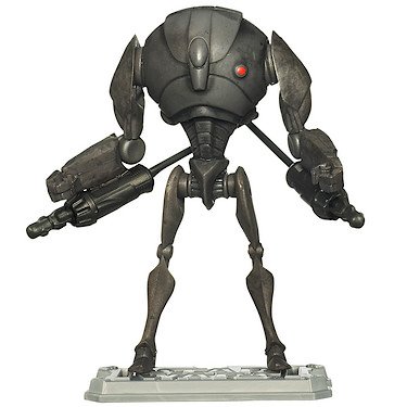A super battle droid is harder to destroy than its more vulnerable predecessor. This powerful droid has a protective body case and built-in double-laser blaster. Once it is unleashed on a target, a super battle droid does not cease advancing and firing its weapons until the object of its attack has been eliminated.