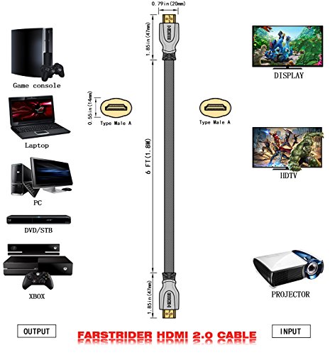 FARSTRIDER HDMI 2.0 Cable 6 Feet (1.8 Meters) Ultra High Speed, 4K, 1080P, 3D, CL3, Ethernet, Audio Return, In Wall Install, Zinc Alloy, 24K Gold Plated, Nylon Mesh for HD TV, Gun Black - Latest
