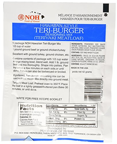 -. Feature : Made in Hawaii / Just add water / Teriyaki flavor hamburger mix / 10 calories from fat; No MSG