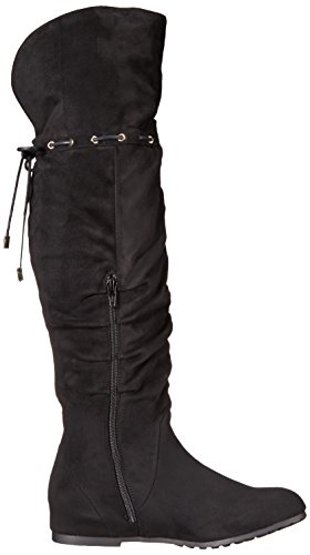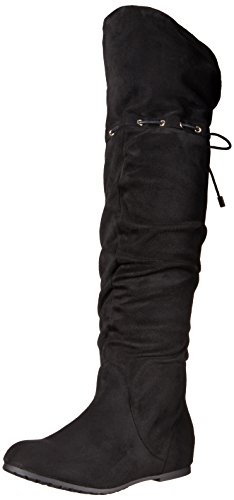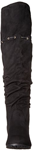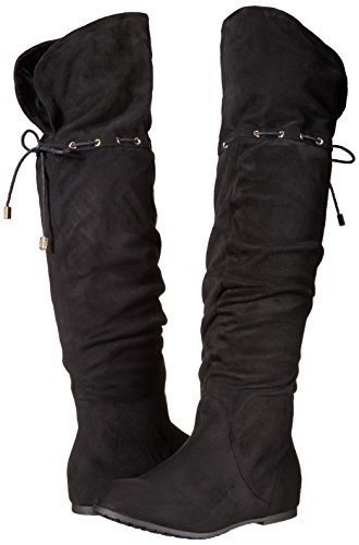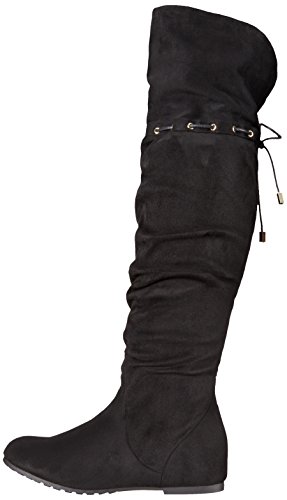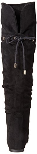 -. Feature : Faux-suede over-the-knee boot with gold-tone eyelets and tie at back / Asymmetric opening / Partial instep zipper