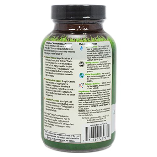 -. Binding : Health and Beauty -. Brand : Irwin Naturals -. EAN : 0710363262372 -. Feature : Ginkgo Smart Maximum Focus & Memory is specially formulated to help you maintain your mental edge, delivering powerful brain-boosting nutrients to keep your mind sharp and your memory at its best. -. IsAdultProduct : 0 -. Label : Irwin Naturals -. LegalDisclaimer : *These statements have not been evaluated by the Food & Drug Administration. This product is not intended to diagnose, treat, cure or prevent any disease. //// BioPerine® is a registered trademark of Sabinsa Corporation. -. Manufacturer : Irwin Naturals -. PackageQuantity : 60 -. ProductGroup : Health and Beauty -. ProductTypeName : HEALTH_PERSONAL_CARE -. Publisher : Irwin Naturals -. Studio : Irwin Naturals -. Title : Irwin Naturals Advanced Ginko Smart, 60 ct -. UPC : 710363262372