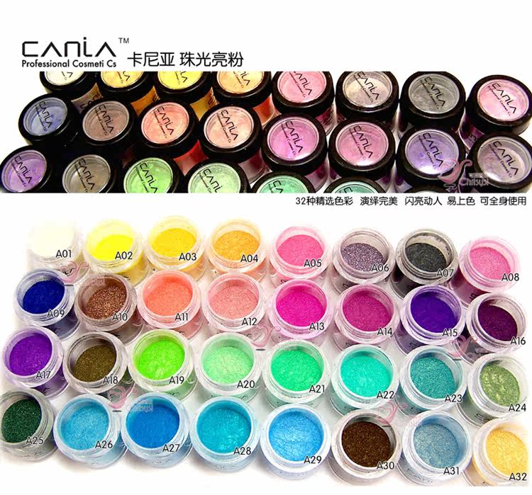产品名称:专业线彩妆CANIA珠光亮粉/提亮闪粉/钻石龙粉/眼影粉产品介绍:32种精选色彩,饱和度好,超质感,闪亮动人,易上色,可在全身使用