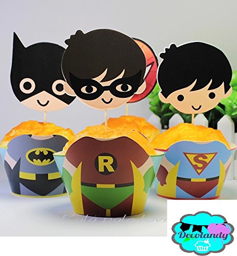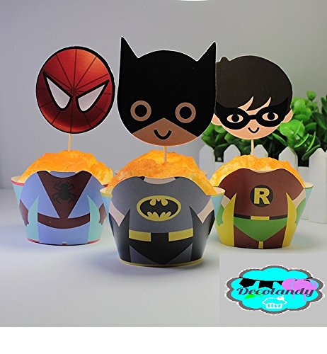 Decolandy 12 set Supercute Superhero cupcak etoppers and wrappers,Avegers Cupcake toppers and wrappers,Superhero party decoration,Superhero party decoartion
