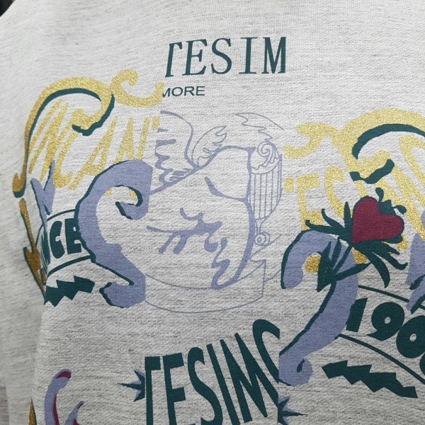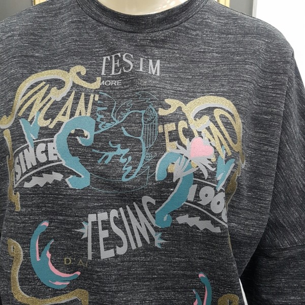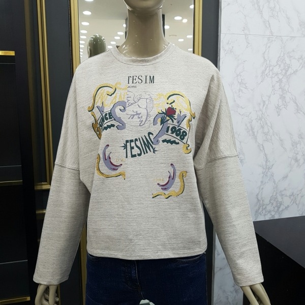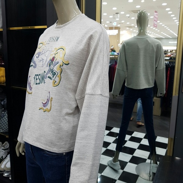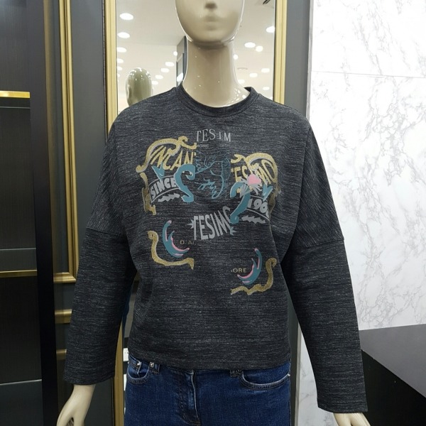 프린트가 포인트 된 맨투맨 티셔츠로 길이감이 살짝 짧은 티셔츠입니다