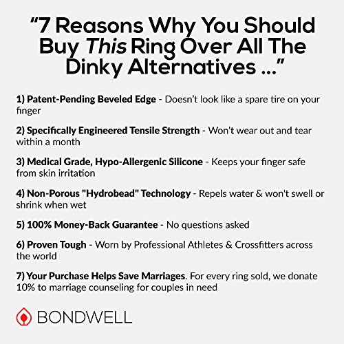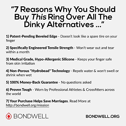 Don't Risk Losing Your PRICELESS Ring .. or Finger! Show your commitment everywhere with this safe, durable, high-quality silicone wedding band. Did You Know... In the US alone, 2,400 divorces happen EACH EVERY DAY?! Bondwell was founded to build stronger marriages by offering the strongest active wedding rings in the world. For every ring sold we donate 10% to our non-profit partners, which covers the cost of marriage counseling for couples in need. With your help, we can save thousands of marriages worldwide.So what are you waiting for?! Buy a ring and save a marriage today! You'll love it. Your wife will love it. And you'll help save a marriage in the process. 0