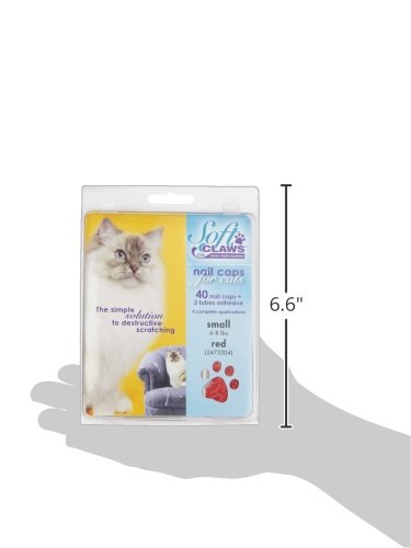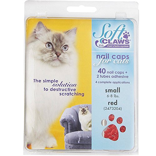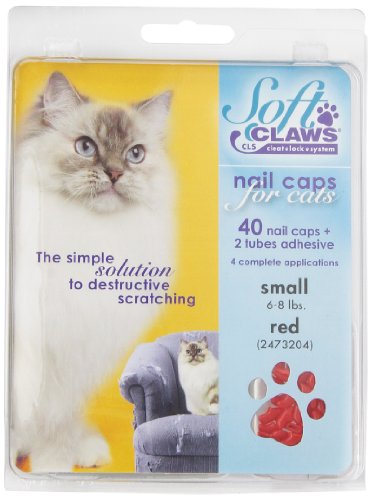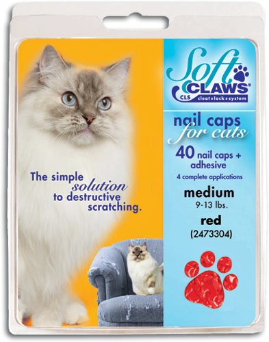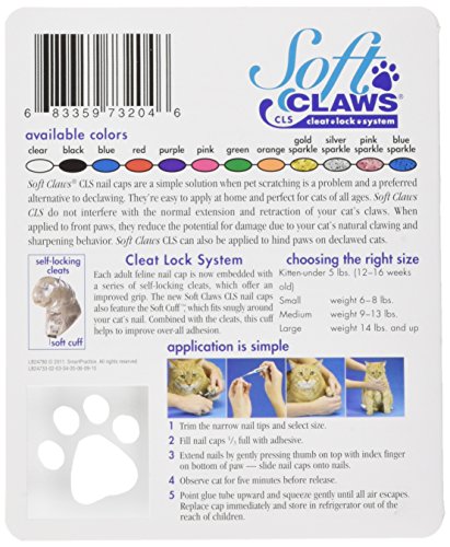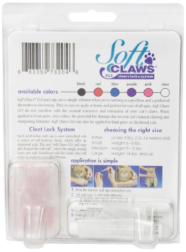 Product Description Soft Claws Nail Caps are a simple alternative to declawing when pet scratching is a problem. They are easy to apply and are perfect for cats of all ages. Soft Claws do not interfere with the normal extension and retraction of your cats claws. When applied to front paws, they reduce the potential for damage due to our cat's natural clawing and sharpening behavior. Kit contains: 40 nail caps, 2 tubes adhesive and glue applicator. Sizes: Kitten, small, medium and large and in color choices of purple, pink, clear, blue and red. Kitten comes in clear only. Most average size cats wear medium. If your cat is very small boned, choose the small size. Very large boned cats tend towards large. Kittens ususally are big enough to wear soft claws by 12 - 16 weeks of age. Directions: To test, try a nail cap on first without the adhesive. If it looks too big, don't glue it on. The nail cap should fit snugly, like a glove. The nail caps can also be trimmed to fit if needed. Kittens up to about 5 months of age and 5 pounds body weight generally fit into the kitten size.