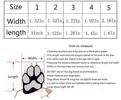 -. Feature : Made of tough, water resistant material,Flexible,skid-resistant and waterproof sturdy soles, capable to keep debris out, not only bring more comfort and keep your love dog clean when they running outside.but also keep their paws warm and walking on snow safty in winter / Flexible, nonslip and waterproof faux leather soles, well provide traction and protect paws in daily environment. / Lightweight, soft and hand washable, practical for small dogs or puppies in daily walks during spring, summer, fall,and winter / Zip fastener and Velcro Tape design for easy put on and take off / SIZE REFERANCE: 2.9"*2.5"(L*W)(size 4 for 30-42 lbs; size 1 for 40-55 lbs; size 2 for 52-65 lbs; size 3 for 63-75 lbs; size 5 for 74-88 lbs)