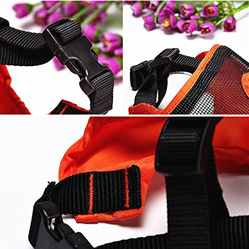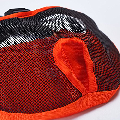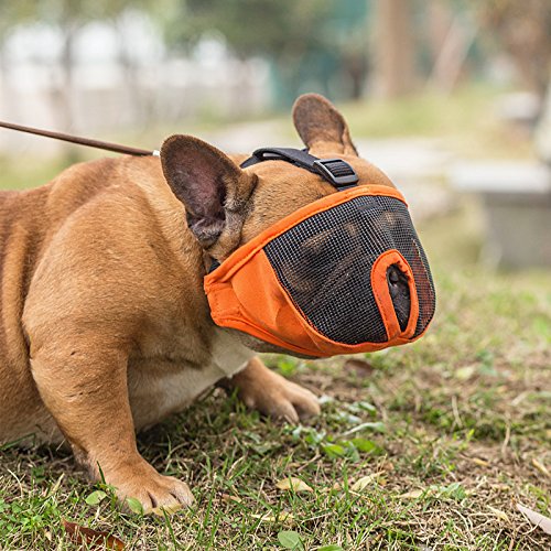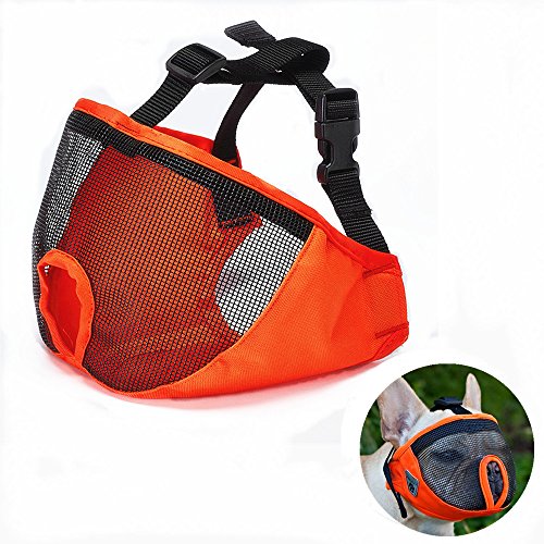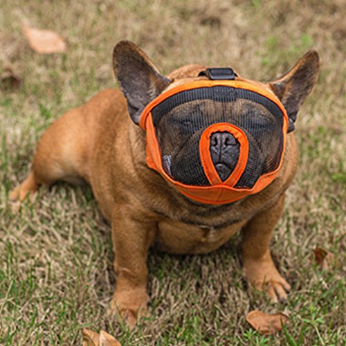 Description: Material: Mesh and Nylon Color: Orange Size: Medium,Neck dimension 11-17 inches Made from breathable mesh and durable nylon construction Adjustable slider and easy to use side release buckle Soft bumpers that prevent the mesh from rubbing on eyes Size M Suit for French Bulldog,pug,boston Terrier.