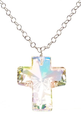 -. Feature : Cable chain necklace featuring faceted Aurora Borealis Cross Pendant / Twisted Wire Bail / SP.R.Ing ring clasp / Domestic