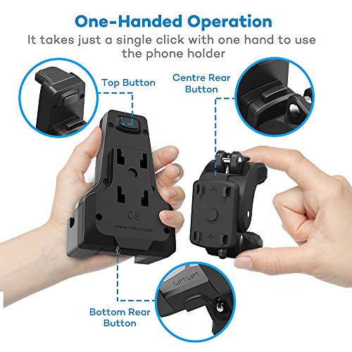 One-Handed Operation: Takes a single click with one hand to use the phone holder; top and rear buttons adjust arm length and width; additional button separates the base from the holder