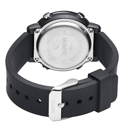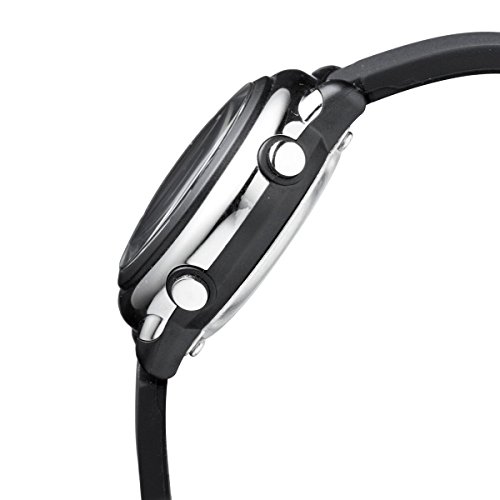 A fun sporty multi function digital watch with day and date, alarm and stopwatch functions. A 50 meter water resistant resin black and silver case and a soft comfortable rubber silicone adjustable strap.Feature