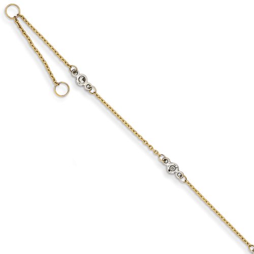 -. Binding : Jewelry -. Brand : The Black Bow -. Color : Yellow -. Department : womens -. Feature : Polished 14k yellow and white gold design / Bezel set clear cubic zirconia gemstones / Closes with a classic sP.R.Ing ring clasp / Adjustable length / Includes our custom gift box -. Label : The Black Bow -. Manufacturer : The Black Bow -. Model : A8497 -. MPN : A8497 -. NumberOfItems : 1 -. PackageQuantity : 1 -. PartNumber : A8497 -. ProductGroup : Jewelry -. ProductTypeName : FASHIONNECKLACEBRACELETANKLET -. Publisher : The Black Bow -. Studio : The Black Bow -. Title : Two-Tone Adjustable CZ Station Anklet in 14 Karat Gold, 9 Inch