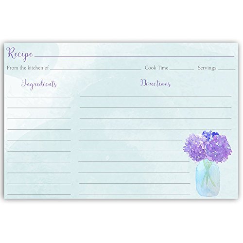 Recipe Cards, Hydrangeas, Mason Jar, Hydrangea, Purple, Blue, Indigo, Lavender, , Bridal Shower Gift, Floral, Country, Wedding, Housewarming, Double Sided with Lines, 4 x 6, 24 Printed Cards