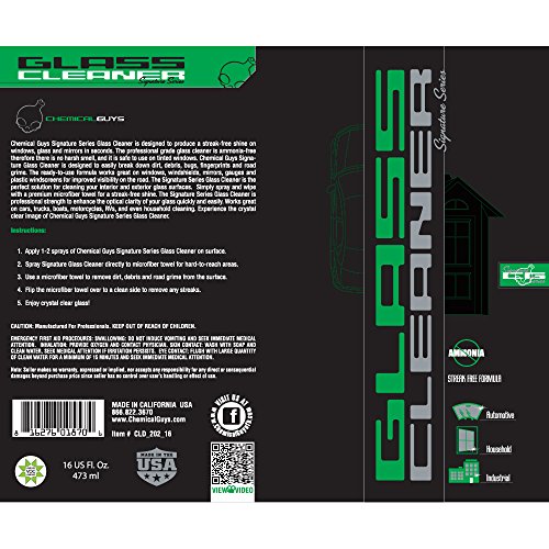 Chemical Guys Signature Series Glass Cleaner is the perfect way to achieve streak-free glass, windows, and mirrors. The advanced formula is designed to easily break down dirt, dust, debris, bugs, fingerprints, and road grime in seconds. We engineered the Chemical Guys Signature Series Glass Cleaner to be the world's advanced glass cleaner. The professional grade formula is ammonia-free; therefore there is no harsh smell. Chemical Guys advanced formula is safe for tinted glass and great for cleaning interior and exterior windows. Quickly and easily achieve streak-free glass on any car, truck, motorcycle, boat, and even RVs. Signature Series Glass Cleaner is also great for cleaning household and industrial windows. Chemical Guys designed Signature Series Glass Cleaner to perform with ultimate versatility. Chemical Guys engineered glass cleaning formula to clean plastic windshields, gauges, and navigation screens for improved visibility while driving. Here at Chemical Guys, Chemical Guys believe crystal clear glass is important. Clean windows improve visibility and provide a safe driving experience. Chemical Guys Signature Series Glass Cleaner quickly removes dirt, bugs, grime, and road film from your glass for a crystal clear image of the world. Simply spray a light mist to any glass surface, wipe with a premium microfiber towel, and enjoy streak-free glass. The unique formula works on any glass surface. Easily clean computer screens, LCD televisions, household windows and even plastic windscreens. Chemical Guys Signature Series Glass Cleaner delivers professional quality results. Dirt and debris simply disappear with a few sprays. Chemical Guys unique formula uses advanced cleaners that clean faster while also repelling dirt and dust by reducing static cling. Generic window cleaners leave streaks and can harm window tint. The advanced Signature Series Glass Cleaner formula will leave a streak-free shine and is safe for tinted windows and plastic.