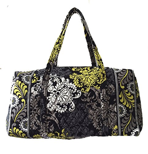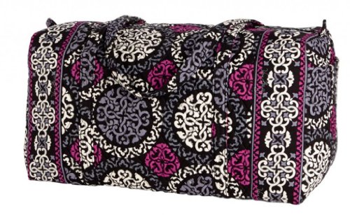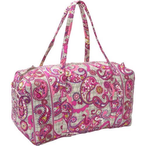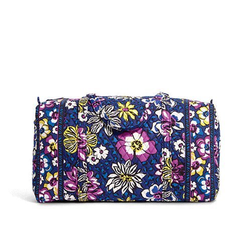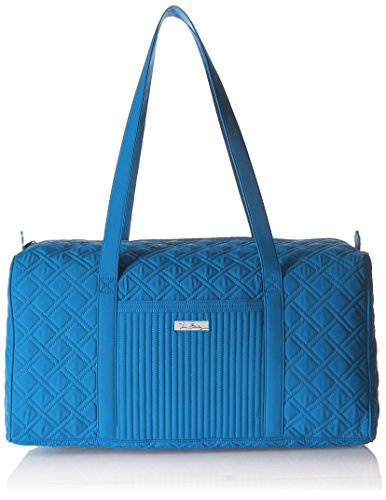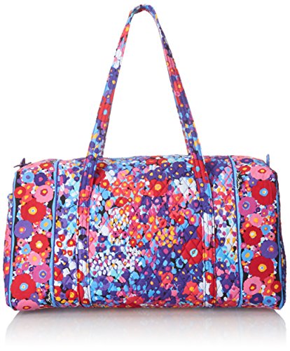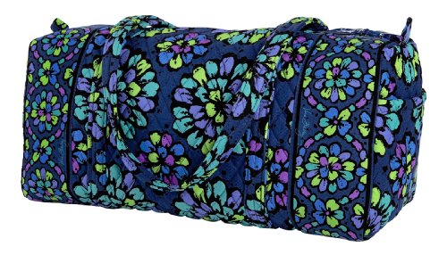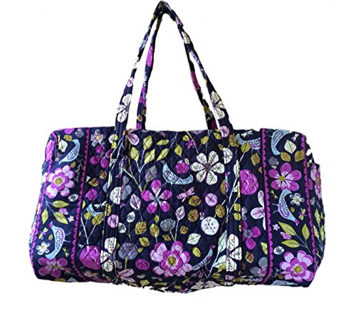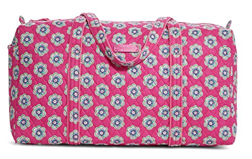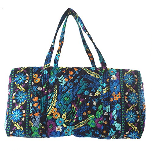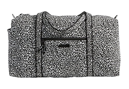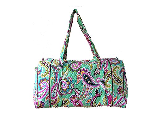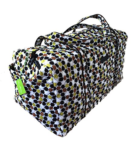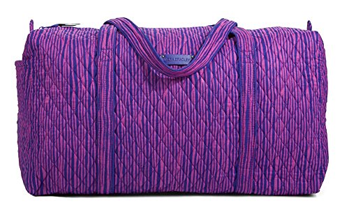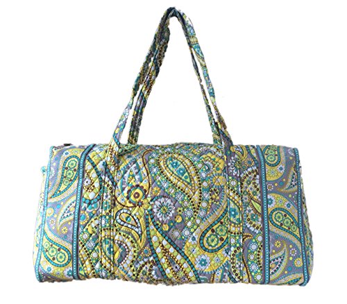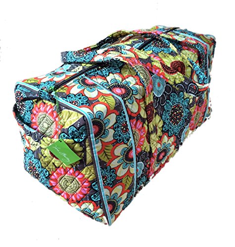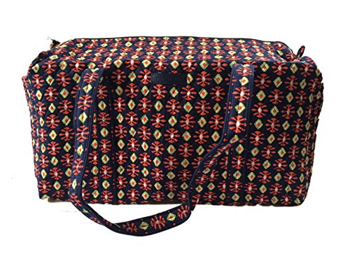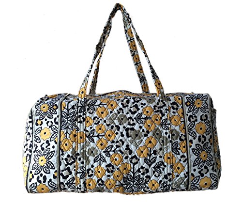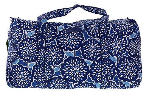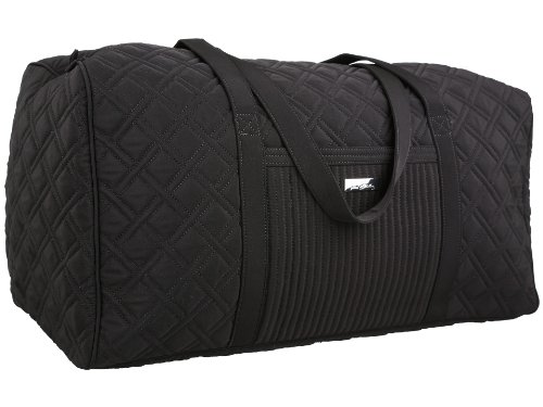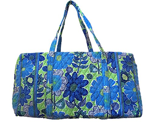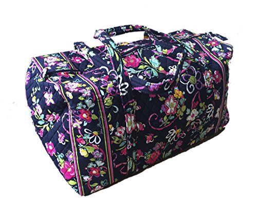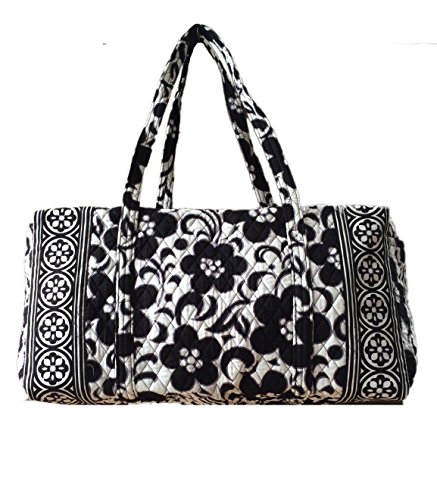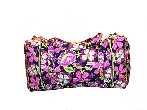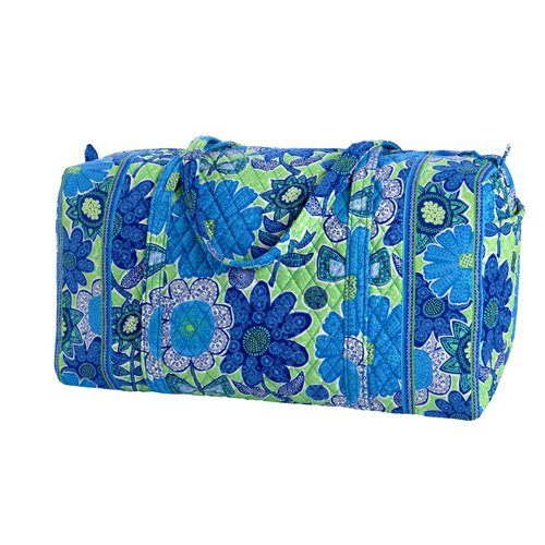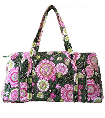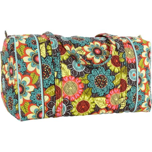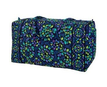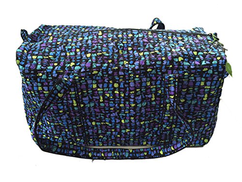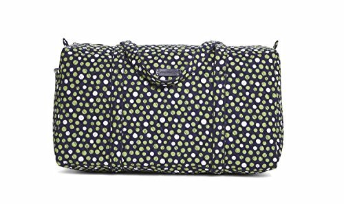 Our durable and spacious Large Duffel tote is made of soft quilted fabric. The fully zippered top closure secures a fully open interior allowing for flexibility in packing. There's an open slip pocket on the end for easy access storage. The dual straps have a comfortable drop of about 16", and are sewn from the bottom, all the way up each side. Our Large Duffel is versatile - use it for travel (it's carryon compliant), an overnight bag, or for gym, dance or gymnastics for yourself or for children. It's lightweight, and easily maintained and it can be placed in the wash. It measures 22" long x 11.5" high x 11.5" wide. Machine wash cold, gentle cycle, only non-chlorine bleach as needed, line dry.Feature