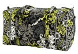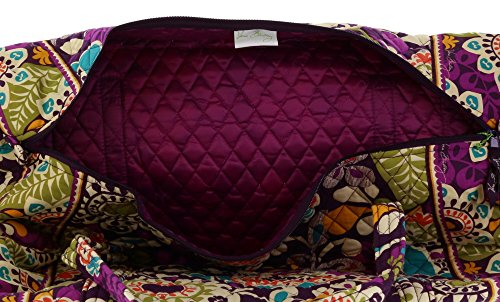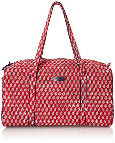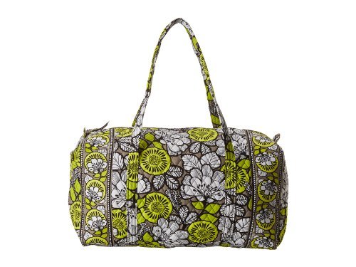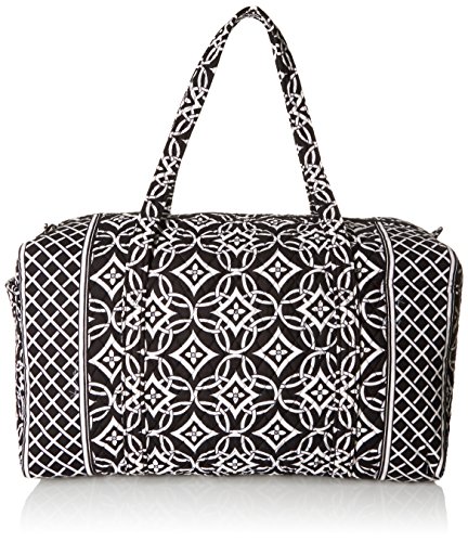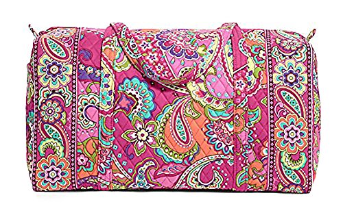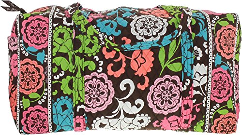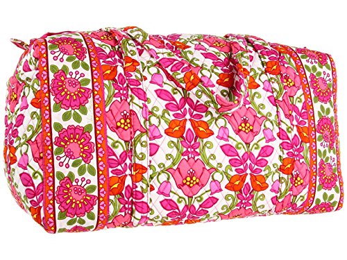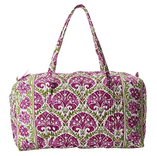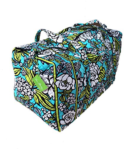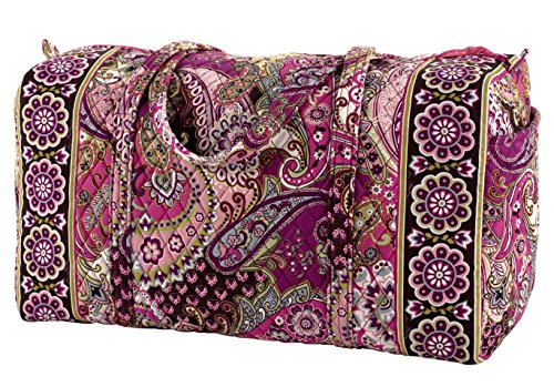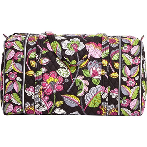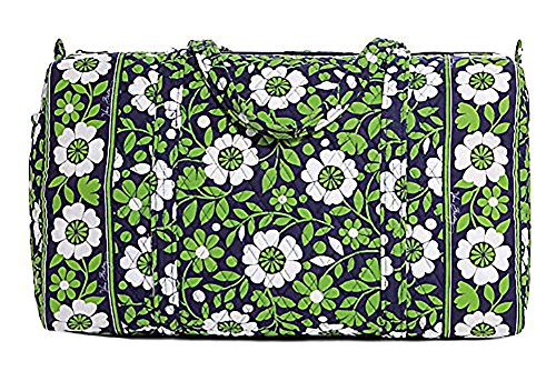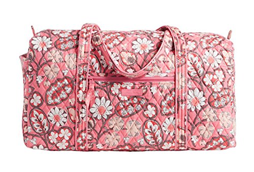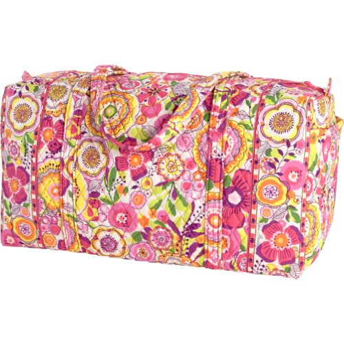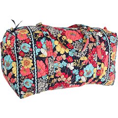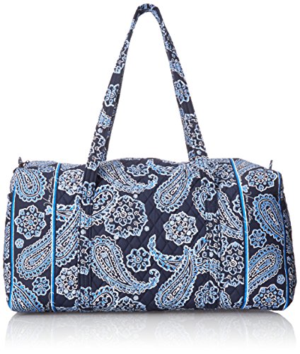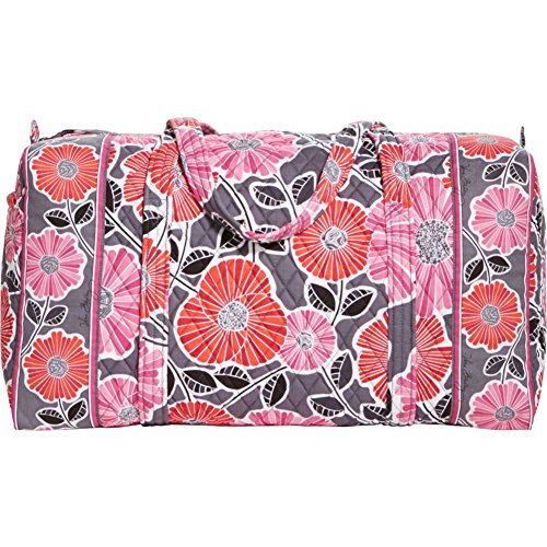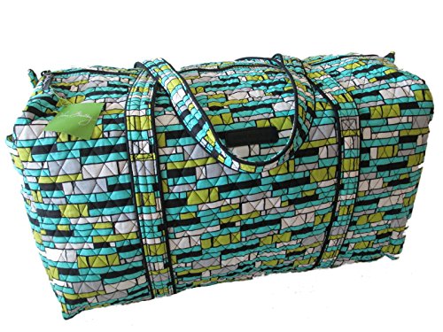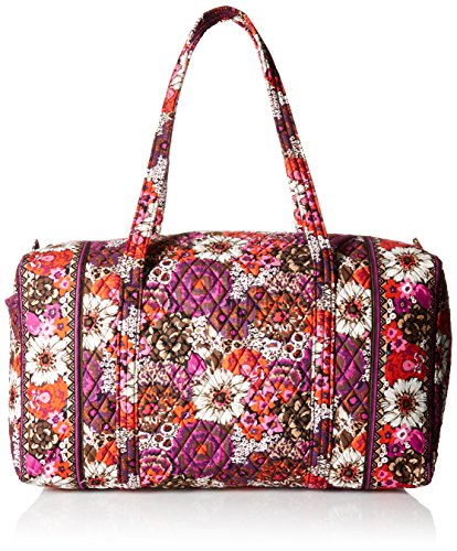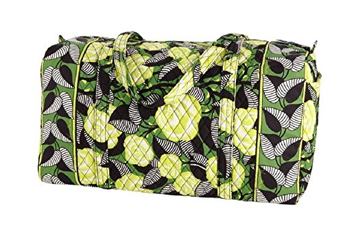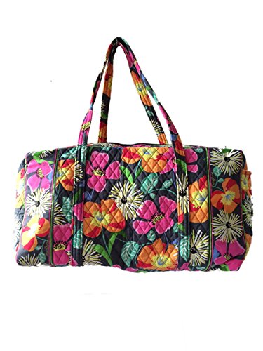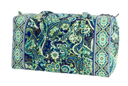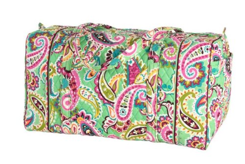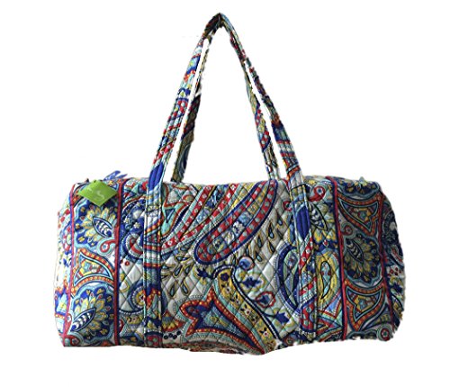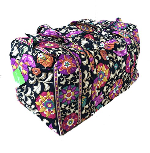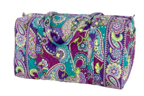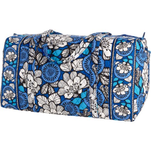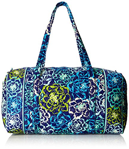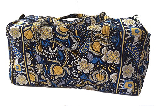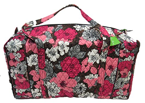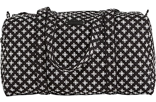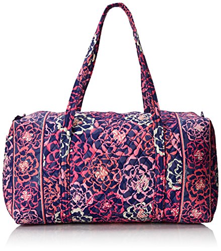 Our durable and spacious Large Duffel tote is made of soft quilted fabric. The fully zippered top closure secures a fully open interior allowing for flexibility in packing. There's an open slip pocket on the end for easy access storage. The dual straps have a comfortable drop of about 16", and are sewn from the bottom, all the way up each side. Our Large Duffel is versatile - use it for travel (it's carryon compliant), an overnight bag, or for gym, dance or gymnastics for yourself or for children. It's lightweight, and easily maintained and it can be placed in the wash. It measures 22" long x 11.5" high x 11.5" wide. Machine wash cold, gentle cycle, only non-chlorine bleach as needed, line dry.Feature