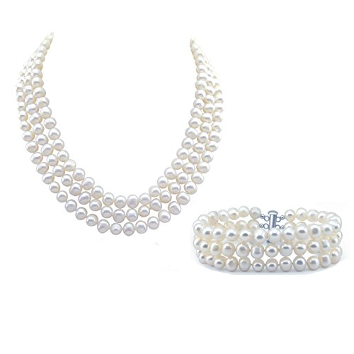 -. Title : 3-row White A Grade Freshwater Cultured Pearl Necklace (6.5-7.5mm), 16.5", 17"/18" and Bracelet 7.5" Sets