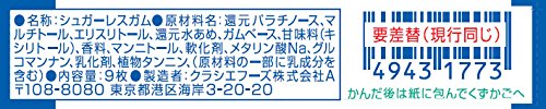 - 原材料:還元パラチノース、マルチトール、エリスリトール、還元水あめ、ガムベース、甘味料、(キシリトール)、香料、マンニトール、軟化剤、メタリン酸NA、グルコマンナン、乳化剤、植物タンニン(原材料の一部に乳製品を含む)
