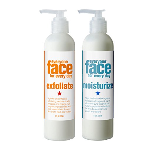 This bundle includes two 8 fl. oz. bottles of Everyone Face for Every Day Exfoliate and Everyone Face for Every Day Moisturize Botanical Skin Care Bundle with Organic Ylang Ylang, Olive, Lemon Peel, Lavender Argan Oil