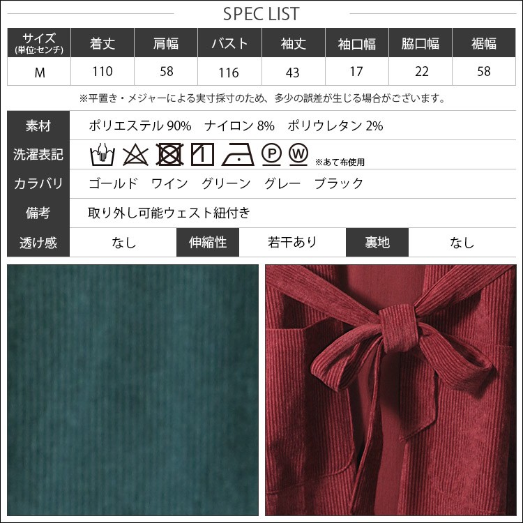 実寸:着丈 110cm 肩幅 58cm バスト 116cm 袖丈 43cm 袖口幅 17cm 脇口幅 22cm 裾幅 58cm