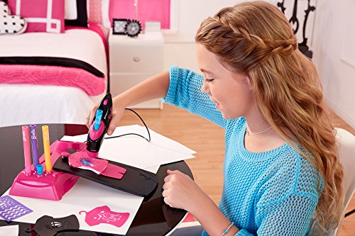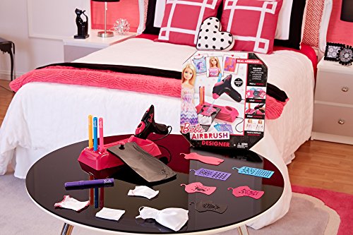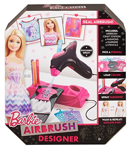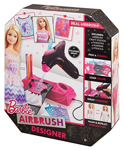 When anything is possible, a girl needs to be able to create her own look! With the Barbie Airbrush Designer, girls can create their own Barbie doll custom designed clothing for the ultimate look to love! And with washable fabric fashions, girls can change that look over and over again. Use is simple. Girls choose a fashion, stencil and colored airbrush marker. Place the selected fashion on the dress form and the dress form on the design platform. Then put an airbrush marker in the airbrush and adjust the spray. Position a stencil on top of the fashion -- or design freehand for a totally unique look -- and spray. Try one color or mix and match, then remove the stencil and admire! Girls can play out the possibilities of their look, then wash and dry the item to start all over. Change a look to match a mood, a story or a style. Girls will love the possibilities for creativity and play. Look for extension packs to expand the options even more (sold separately). Set includes the airbrush with base and design platform, dress form, four washable white fabric fashion pieces, four airbrush markers and five stencils. Fashions fit most Barbie dolls. Doll not included. Colors and decorations may vary.Feature