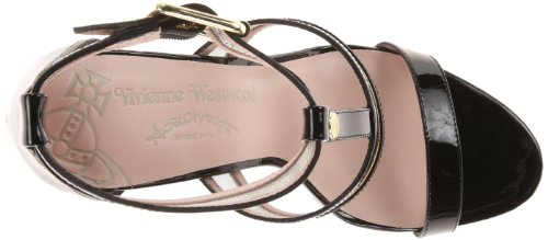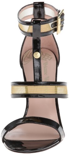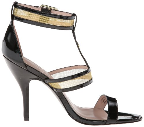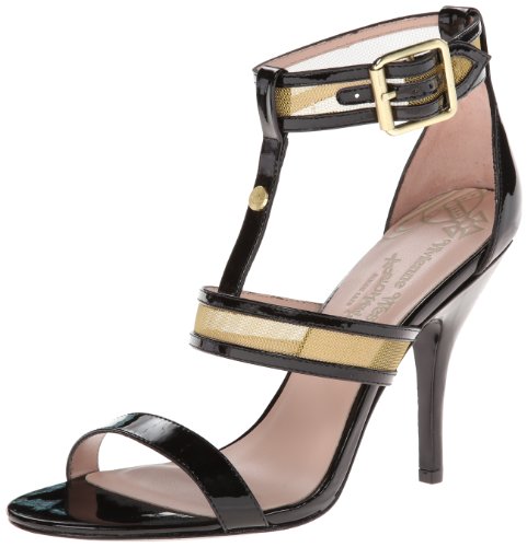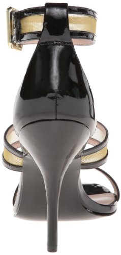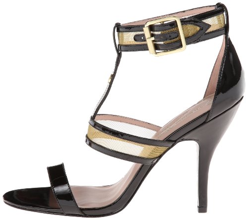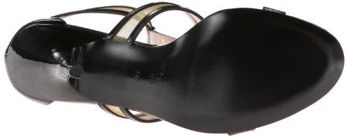Patent leather pump with metallic mesh insets at ankle and vamp straps