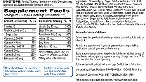 100% or More of Vitamins D B12 and Vitamin E Natural Cherry Berry & Apple Flavors Brand : Centrum MPN(PartNumber) : No Model EAN : 0300054862952 Package Dimensions(LxWxH) : 18x10x10cm ; 794 g