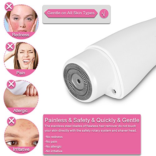 - GENTLE FOR ALL SKIN TYPES: Women hair removal gently and painlessly removes unwanted hair with a safely rotary system and hypoallergenic shaver head, neither pulls hair from the root the stainless steel blades not touch your skin directly, and no more redness, pain, allergic and irritation.