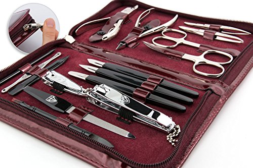 Contents: Hoof stick, nail stick, blackhead remover, double instrument (pusher/cleaner), sapphire nail file, nail clipper, toe nail clipper, nail pusher, nail cleaner, nail knife, nail nippers, cuticle nippers, nail scissors, cuticle cissors, tweezers, splinter tweezers