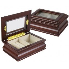 -. Feature : Mahogany finish / Small, compact size perfect for girls' rooms or auxiliary storage for you / Glass display window; Felt-lined compartments: ring rolls & open storage areas / Solid wood construction / Dimensions: 5"x3.5"x2"