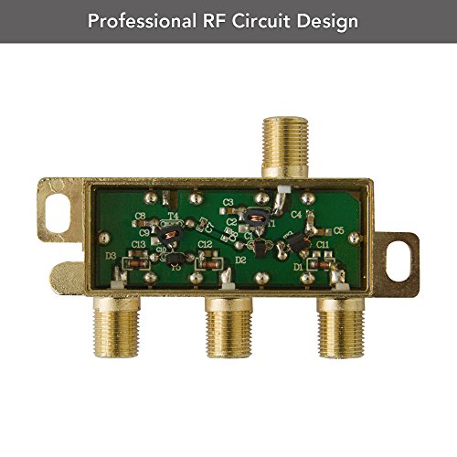 All ports female F connector 75 Ohm All ports DC power pass Light weight and compact size Zinc die-cast with 18K gold-plated Low insertion loss, high return loss and isolation for satellite and over-the-air HDTV signal Two pieces of screws attached
