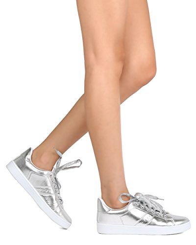 Refresh FG19 Women Metallic Leatherette Round Toe Lace Up Sneaker - Silver