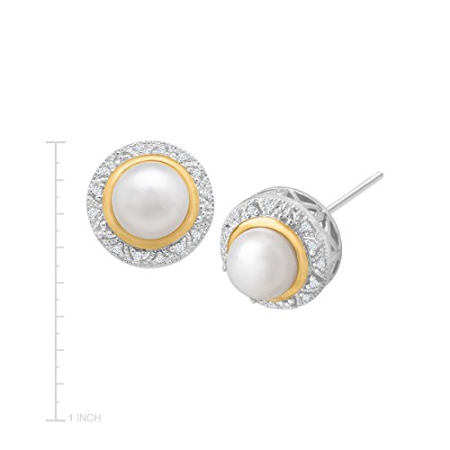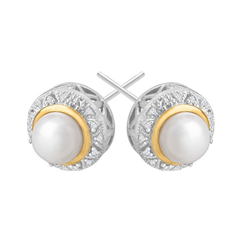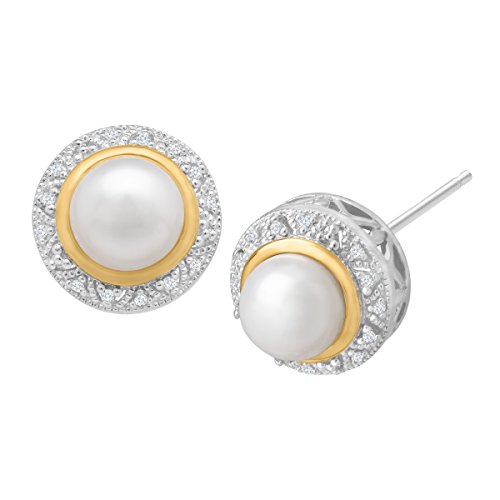Glistening in a diamond halo these ladylike cultured pearl studs are count as a jewelry classic fit for every occasion. A filigree halo of round-cut diamonds ignites a 14K yellow gold bezel showcasing 7 mm round freshwater cultured pearls. These stud earrings are fashioned from a sterling silver gallery setting. Pieces measure 1/2 by 1/2 inches. Pearls have been bleached to enhance their appearance.Feature