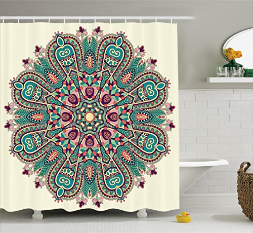 Ambesonne Mandala Decor Collection, Pastel Mandala Indian Symbol of Lotus Flower with Square and Triangles Artsy Work, Polyester Fabric Bathroom Shower Curtain Set with Hooks, Purple Cream Teal