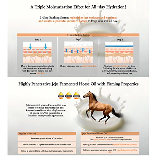 Highly Penetrative Jeju Fermented Horse Oil with Firming Properties Jeju fermented horse oil is emulsified into cream to quickly moisturize skin and increase its resilience with a high amount of omega-3/6/9 in the milk for a healthier, more youthful appearance.