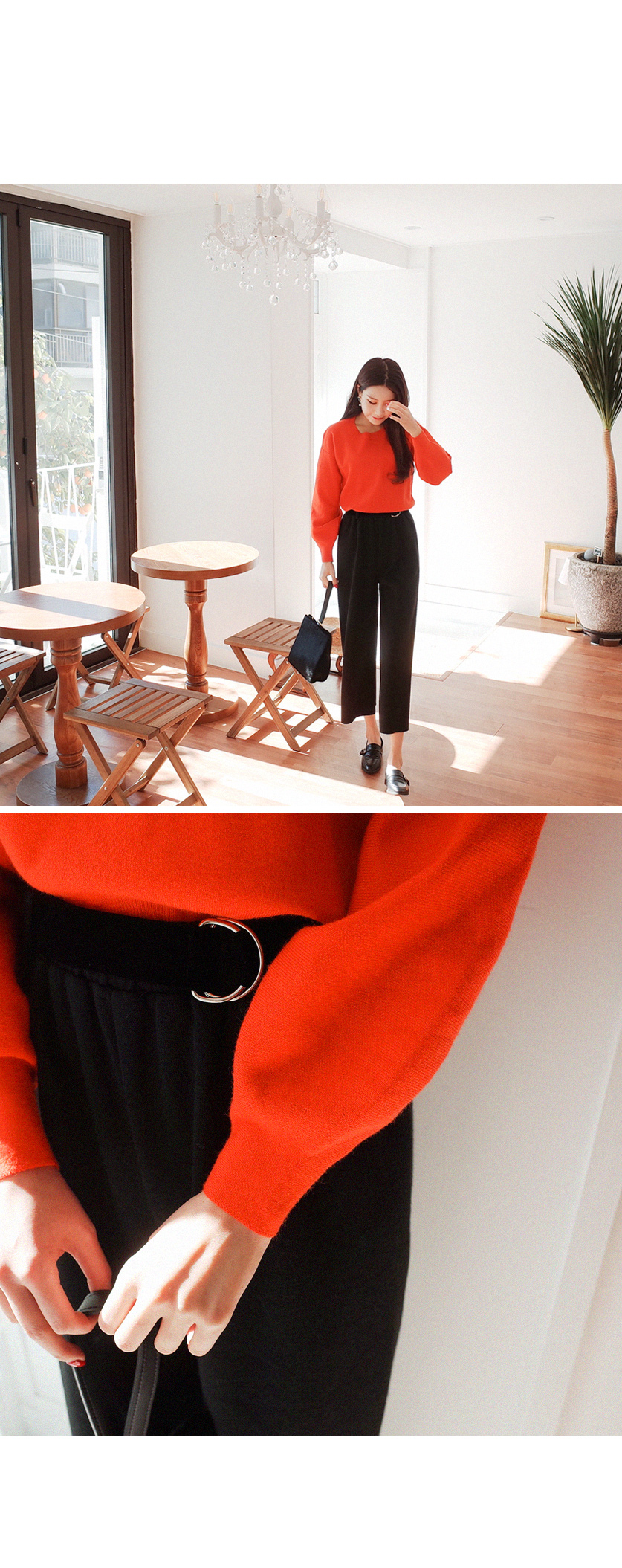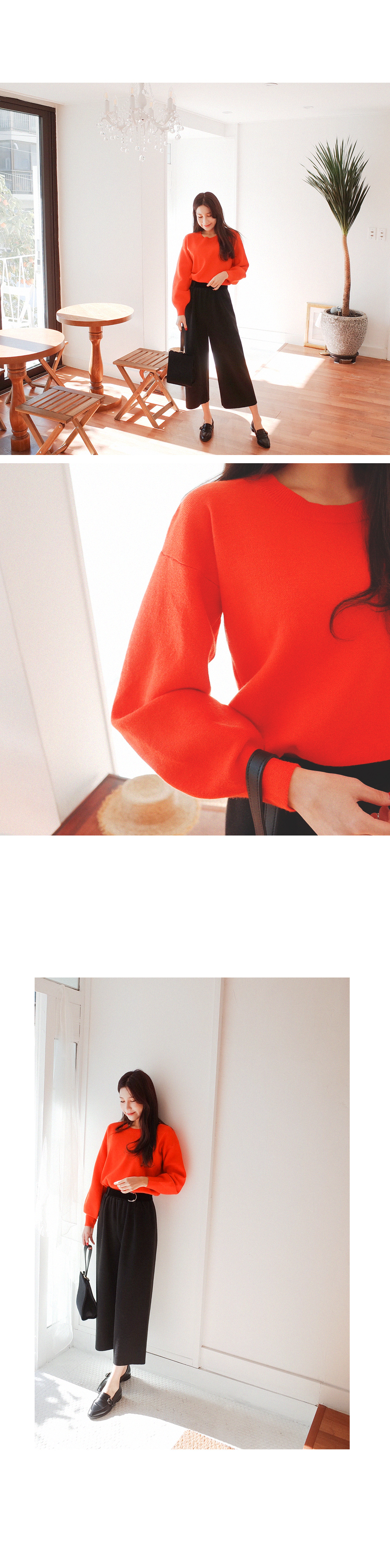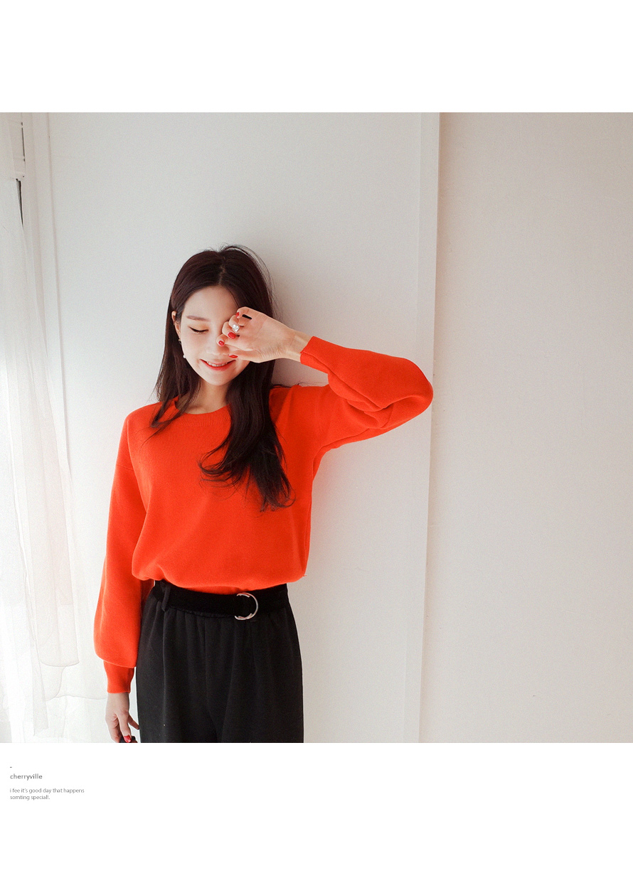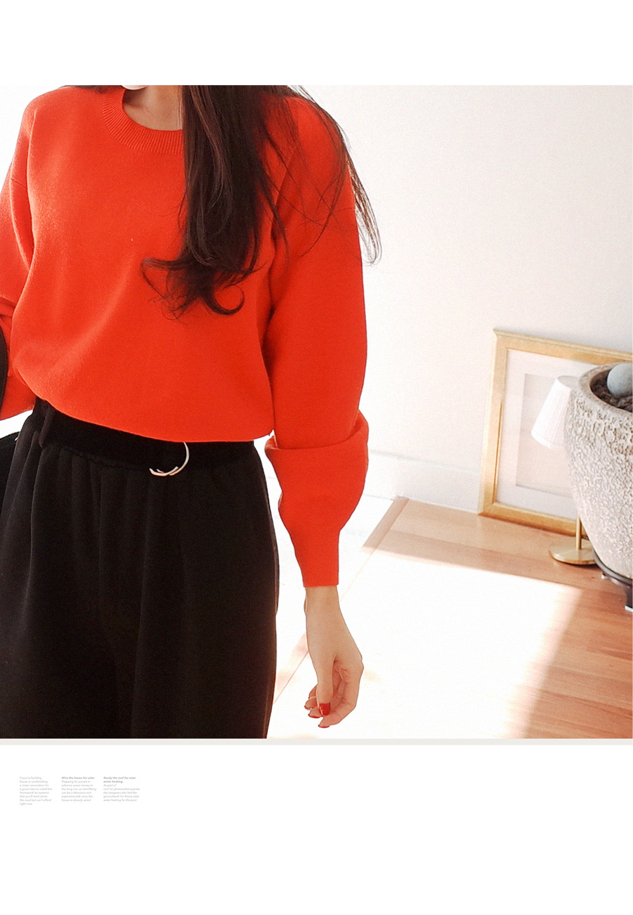 라운드넥 스타일이며 볼륨감있는 소매 디자인이
