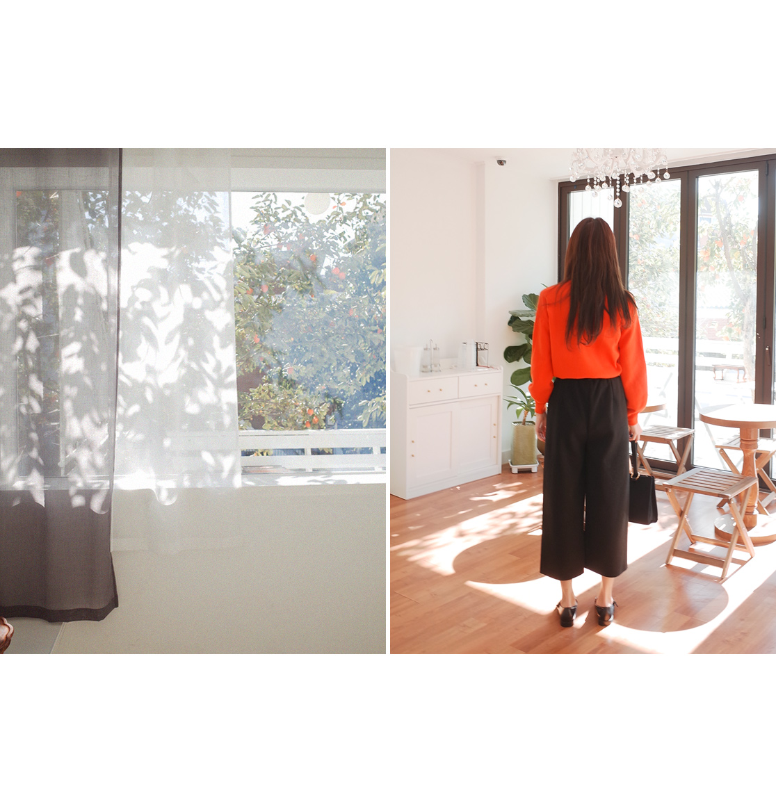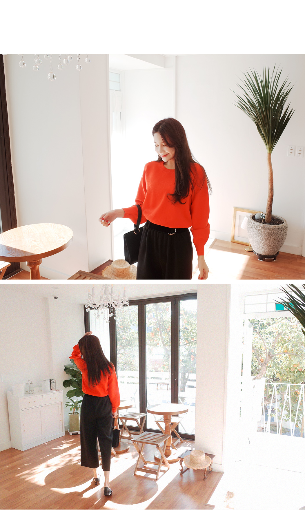 소매핏을 잡아주는 오렌지컬러 니트에요