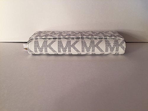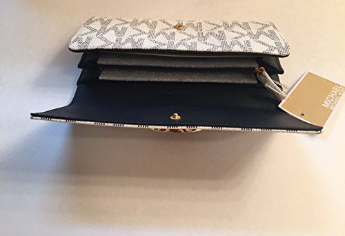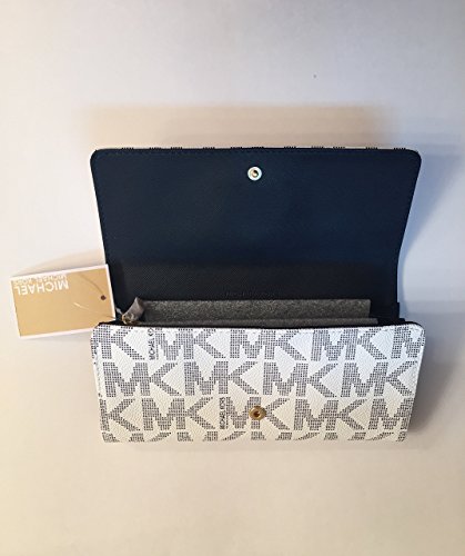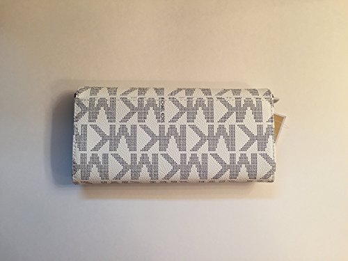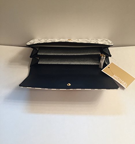 Description: -Condition: 100% authentic, brand new, with tag -Color: Vanilla/Navy Blue -MK signature PVC / MK signature fabric lining - Flap snap closure with MK logo on front / open slip pocket on back - Center zippered coin compartment / 14 card slots / 2 full length bill compartments / 2 gusseted pockets - Gold tone hardware -Dimensions: 7.75" H x 4" W x 1" DFeature