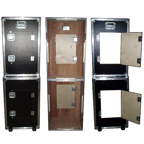 -. Feature : ID Of Top Half Approx 35 x 22 x 11 1/2 Deep - Bottom Half Approx 35 x 22 x 15 1/2 Deep / 3/8 Plywood ATA Construction - 1/4 False Front Panels - Hard PVC Black Laminate / Aluminum Extrusions - 2 Removable Large Hinges To Connect Case Halves Together / 6 Recessed Handles - 2 Large Recessed Catches - Steel Flat Corners / Easy to Install Dolly Wheel Kit - 2 Rear Trap Doors Each 14 x 20 High