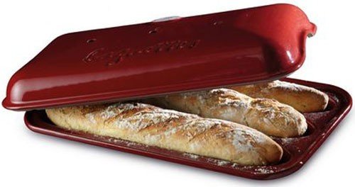 Studio : Emile Henry Publisher : Emile Henry Binding : Kitchen Product Description The new ceramic baguette baker from Emile henry bakes three, 131/2inch long by 21/4inch wide, artisanal French baguettes. The baguette baker traps steam from the baking bread to create an environment similar to a steam-injected oven. The steam gives the bread a crunchy, golden crust and a chewy interior. The baguette baker simplifies the process so home bakers have more consistent, delicious results every time they make bread. A recipe book is included with the product so even a novice baker will be confident in baking bread at home. The baker, made in France from burgundy clay. 0