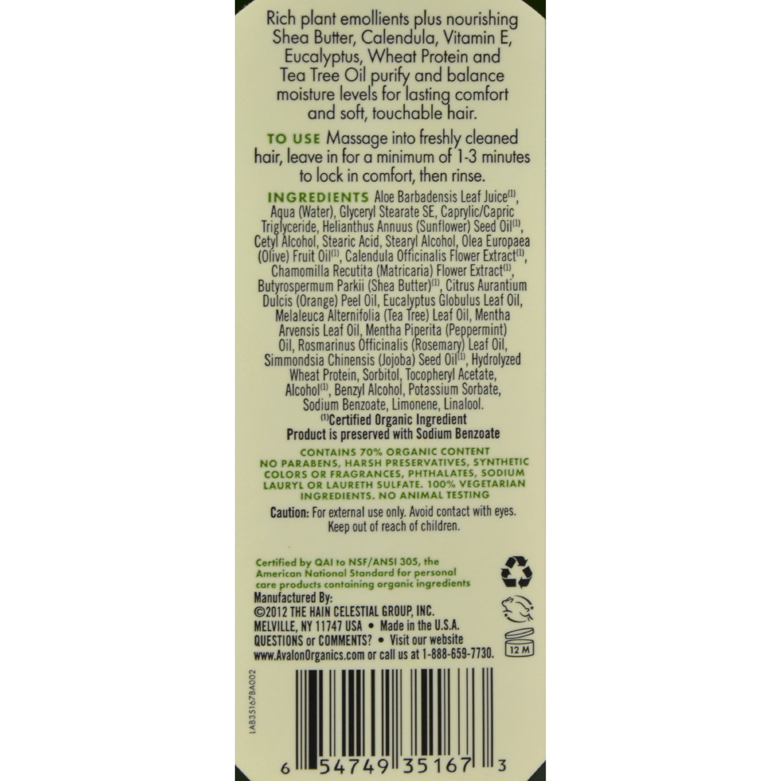 Aloe barbadensis leaf juice(¹), aqua (water), glyceryl stearate SE, caprylic/capric triglyceride, helianthus annuus (sunflower) seed oil(¹), cetyl alcohol, stearic acid, stearyl alcohol, olea europaea (olive) fruit oil(¹), calendula officinalis flower extract(¹), chamomilla recutita (matricaria) flower extract(¹), butyrospermum parkii (shea butter)(¹), citrus aurantium dulcis (orange) peel oil, eucalyptus globulus leaf oil, melaleuca alternifolia (tea tree) leaf oil, mentha arvensis leaf oil, mentha piperita (peppermint) oil, rosmarinus officinalis (rosemary) leaf oil, simmondsia chinensis (jojoba) seed oil(¹), cyamopsis tetragonoloba (guar) gum(¹), hydrolyzed wheat protein, sorbitol, tocopheryl acetate, alcohol(¹), benzyl alcohol, potassium sorbate, sodium benzoate, limonene, linalool. ¹Certified Organic Ingredient Product is preserved with sodium benzoate Contains 70% organic content. No parabens, harsh preservatives, synthetic colors or fragrances, phthalates, sodium lauryl or laureth sulfate. 100% vegetarian ingredients. Certified by QAI to NSF/ANSI 305, the American National Standard for personal care products containing organic ingredients. |