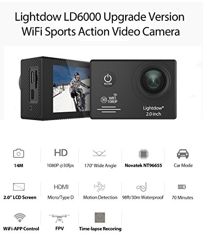 Lightdow LD6000 WiFi 1080P HD Sports Action Camera Bundle with DSP:Novatek NT96655 Chip, 2.0-Inch LTPS LCD, 170° Wide Angle Lens and Bonus Battery (Black+WiFi)